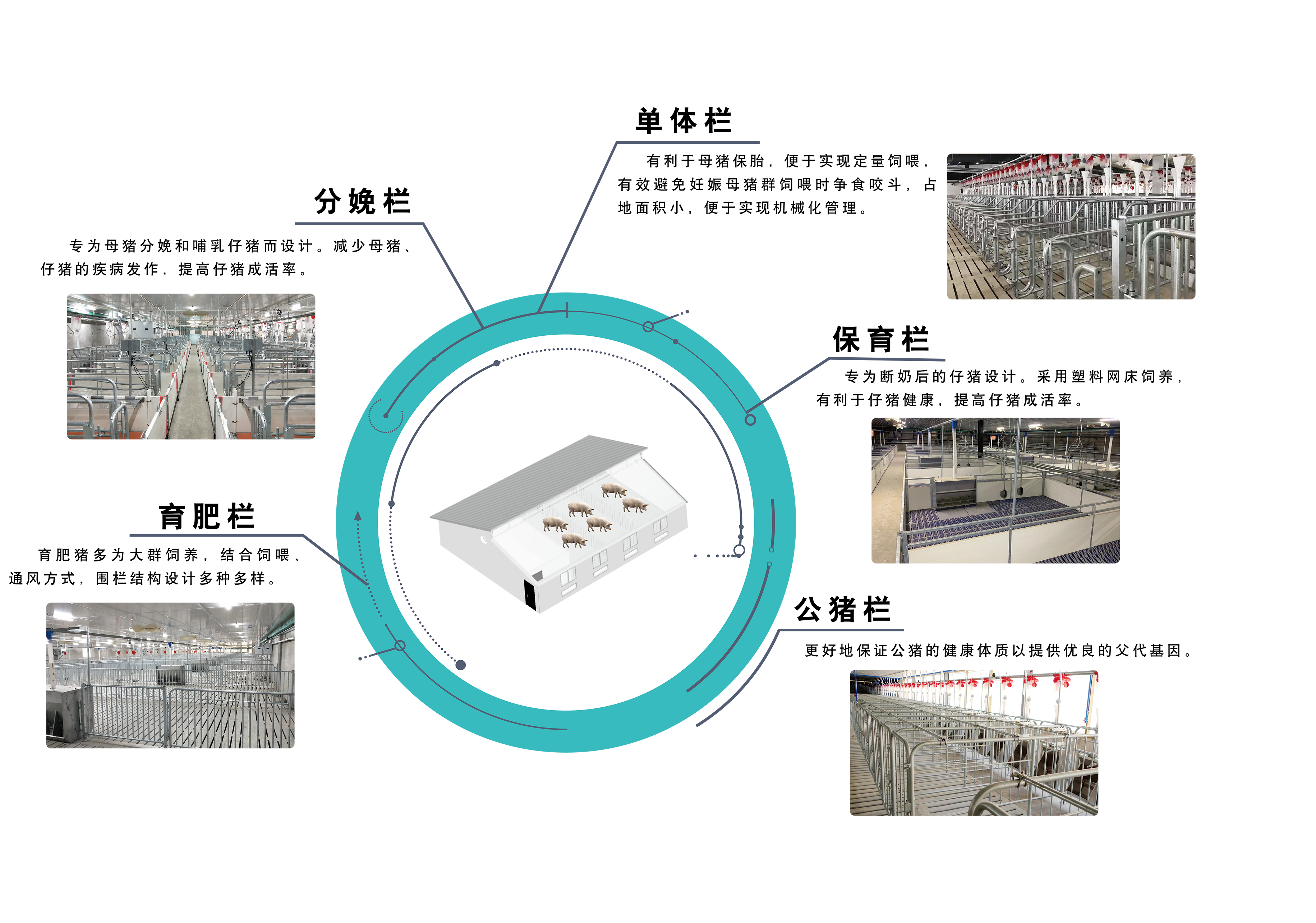 專為分娩母豬與哺乳仔豬設計,每欄飼養1頭母豬+1窩仔豬,限制飼喂;每欄1套保溫燈+ABS透明保溫蓋板;母豬每欄1個不銹鋼料槽、1套不銹鋼防濺式飲水器;仔豬每欄1個補料槽、1套圓形飲水碗; 母豬躺臥區為高強度的鑄鐵地板或三棱鋼地板,仔豬區為PP塑料地板;仔豬圍欄采用500mm高PVC空心板;優質的圍欄與床面設計提供干凈、溫暖的產仔環境,減少母豬、仔豬疾病的發生,提高仔豬成活率。